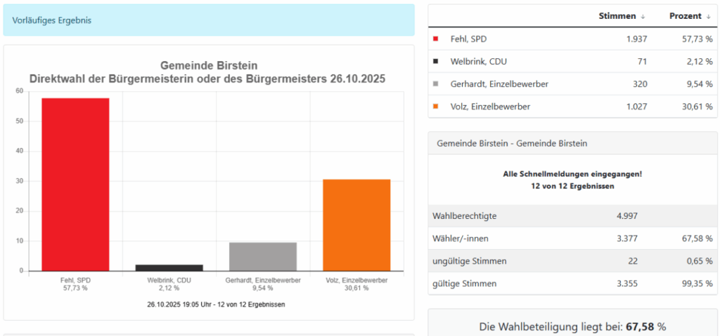 Birstein hat sich am 26.10.2025 im ersten Wahlgang mit der absoluten Mehrheit für den Amtsinhaber Fabian Fehl entschieden. Über 57% der Wählenden entschied sich, den bisherigen Bürgermeister im Amt zu bestätigen.
